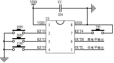上電不工作,OUTH為低電平,OUTL為高電平,短按按鍵開始計時OUTH輸出高電平、OUTL輸出低電平,計時結束電平信號翻轉。中途觸發停止計時輸出信號翻轉。