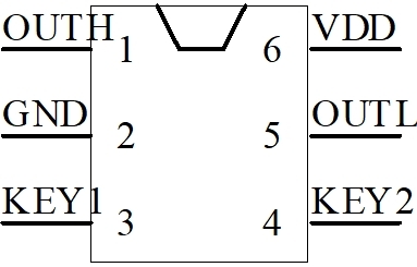 兩路按鍵輸入控制,兩路電平信號同步輸出:一路OUTH高電平輸出、一路OUTL低電平輸出。